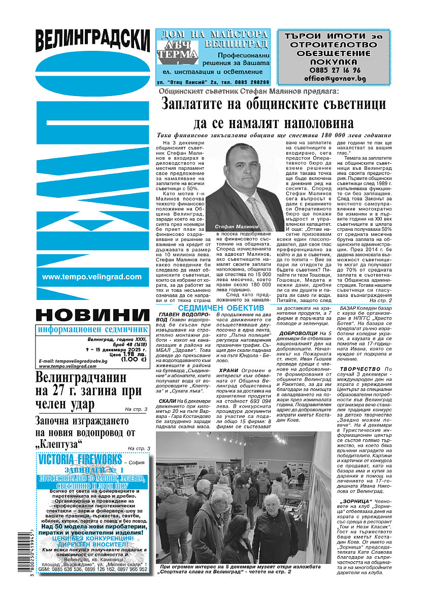 ВЕСТНИК “ВЕЛИНГРАДСКИ ТЕМПО НОВИНИ” съществува вече 30 години и е информационен лидер в региона. Разпространява се в общините Велинград, Ракитово и Сърница.